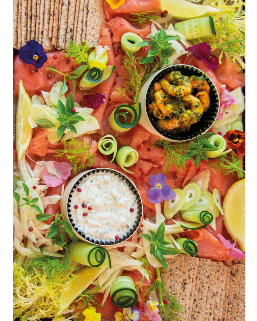 Saumon, crevettes marinées, fenouil, concombre, frisée fine, tzatziki et crackers.