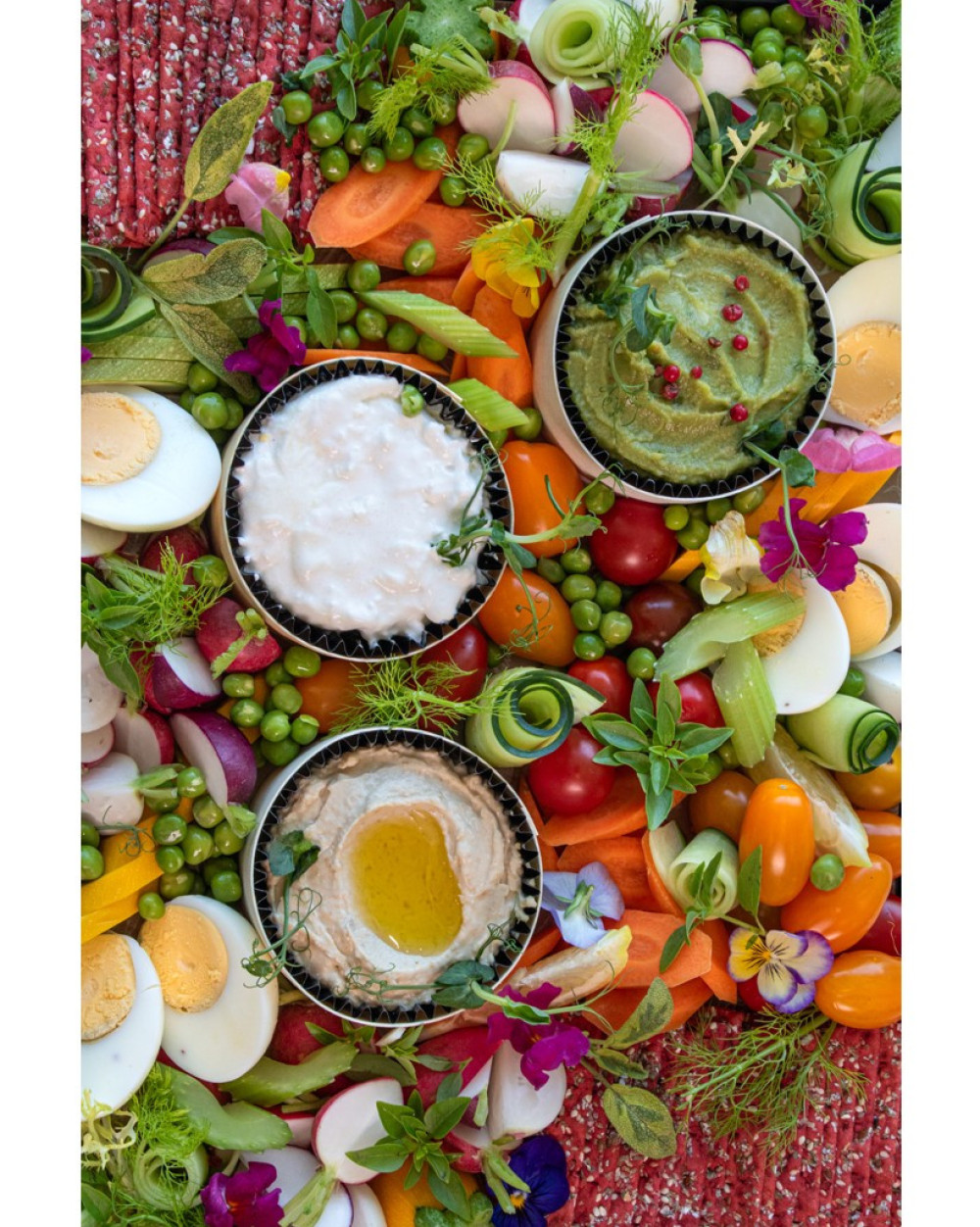 Oeufs durs, radis multicolores, tomates cerises, carottes, courgettes, houmous, guacamole, burrata onctueuse et crackers à a betterave.