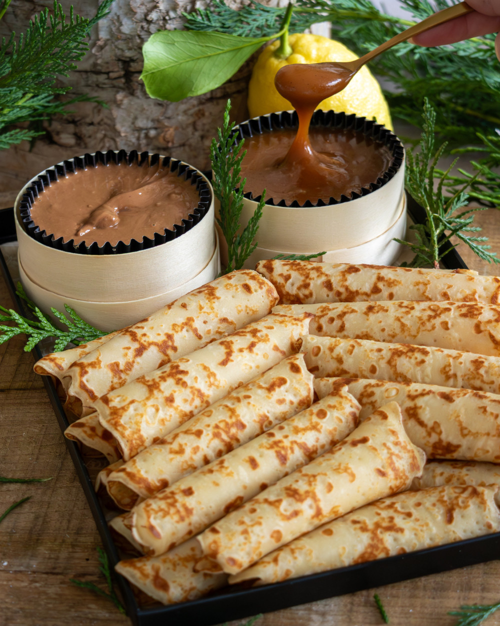 20 crêpes accompagnée de pâtes à tatiner Chocolat Noisette et Caramel beurre salé maison.