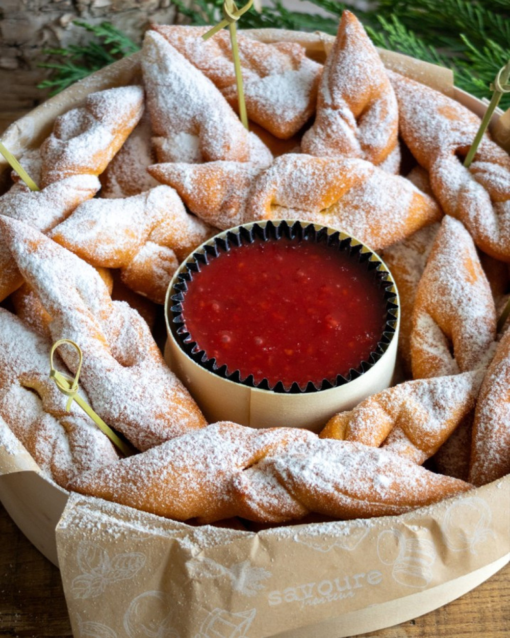 20 bugnes lyonnaises accompagnées de pâte à tartiner aux pralines roses maison.