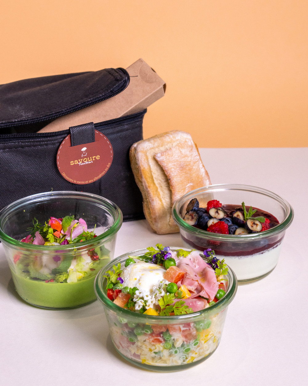 Nos plateaux repas en bocaux sont livrés froids et prêts à déguster dans nos sacs isothermes individuels. Une boule de pain ainsi qu'un kit couverts et serviette sont inclus dans chaque menu.