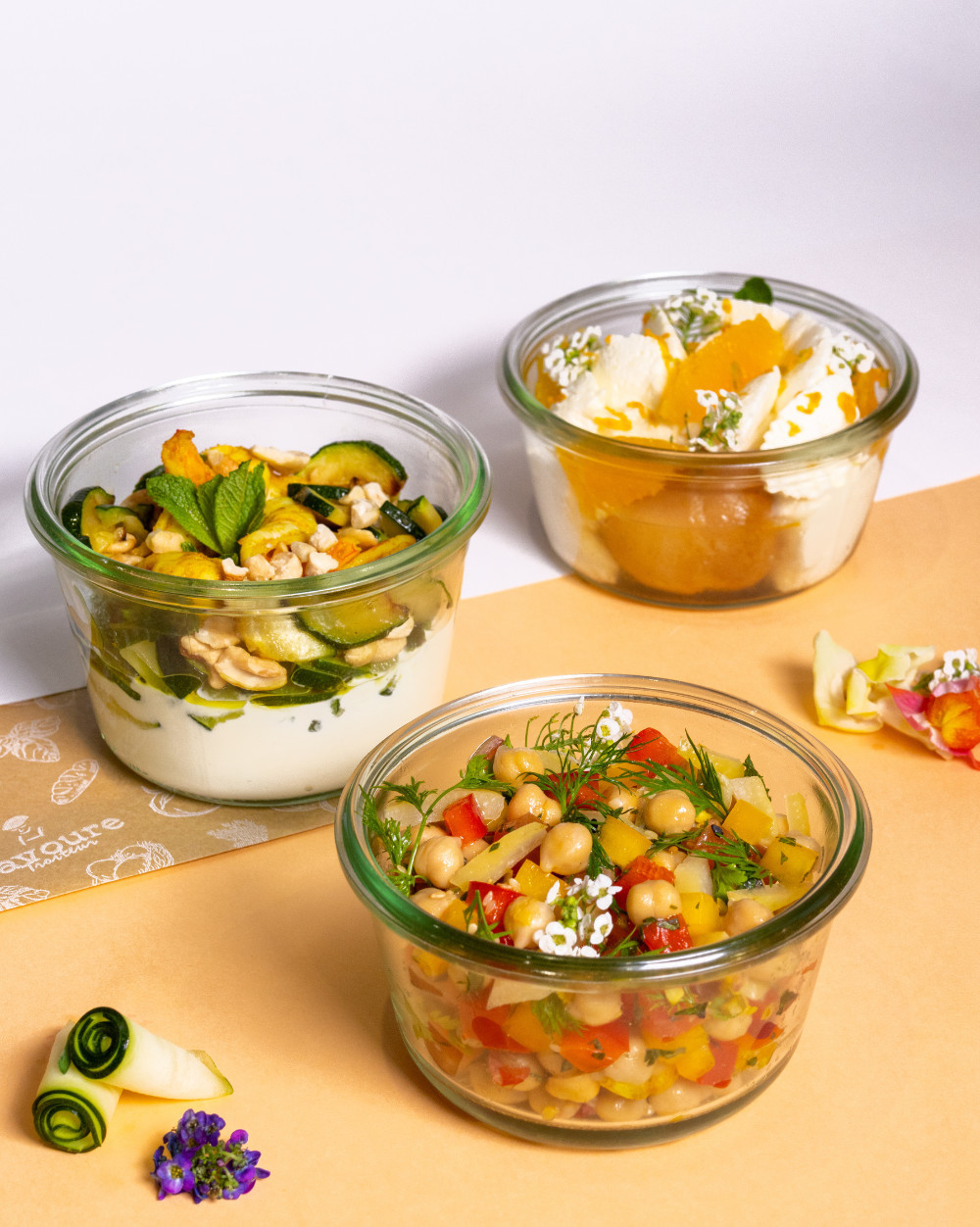 Nos plateaux repas en bocaux sont livrés froids et prêts à déguster dans nos sacs isothermes individuels. Une boule de pain ainsi qu'un kit couverts et serviette sont inclus dans chaque menu.