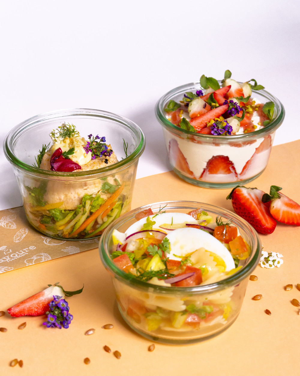 Nos plateaux repas en bocaux sont livrés froids et prêts à déguster dans nos sacs isothermes individuels. Une boule de pain ainsi qu'un kit couverts et serviette sont inclus dans chaque menu.
