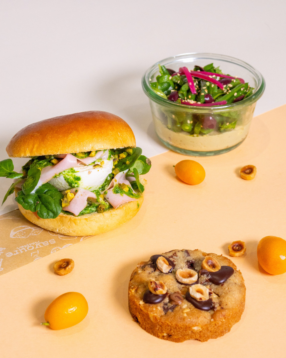 Bun à la mortadelle de Bologne, burratina onctueuse, pesto de roquette et pistaches torréfiées